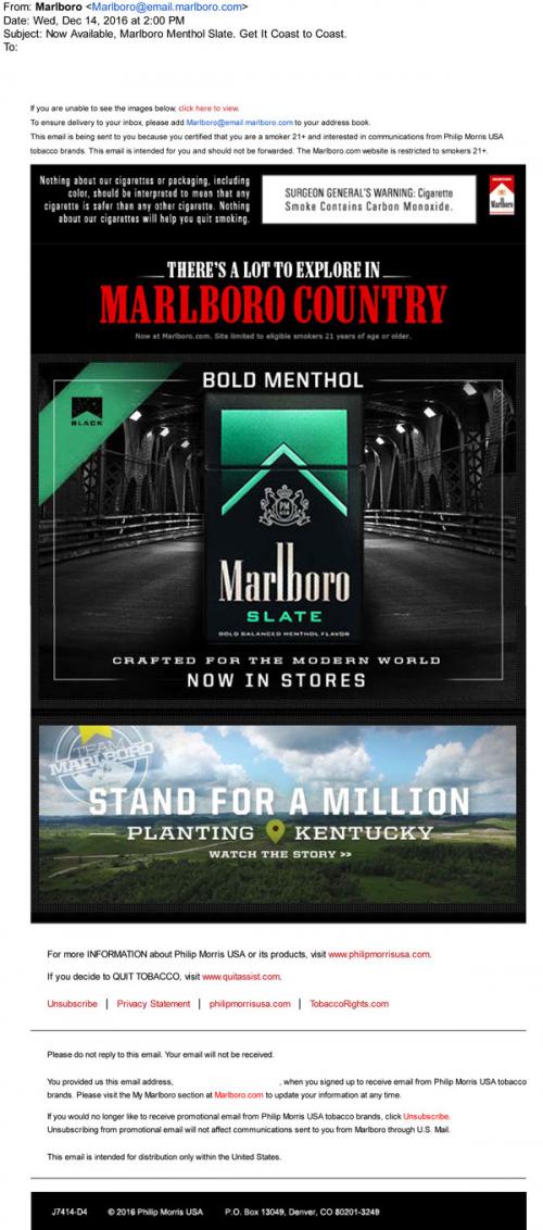 Email from Marlboro in December 2016 to promote Slate from Marlboro Black, their new bold menthol product, now available in stores nationwide. Also invites the recipient to the brand website to check out a video on Team Marlboro's progress with the Stand For A Million tree planting project.