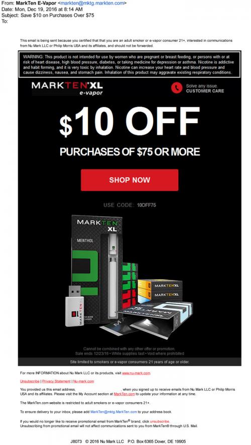 Email from MarkTen in December 2016 offering a discount on purchases made through the brand website when customers use the included coupon code.