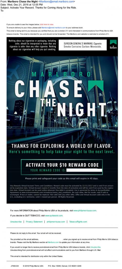 Marlboro Menthol email sent in December 2016 to thank the recipient for participating in the Chase the Night sweepstakes - as a reward, the email includes a code to activate in order to receive a 10$ gift card.