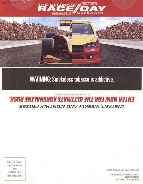 Direct mail from the Pinkerton Tobacco company in January 2017 to promote the Ultimate Race Day giveaway and remind the recipient to enter daily to win on each of the three smokeless brand websites for Red Man, Longhorn, and Timber Wolf. Includes coupons for use on any of the brands.