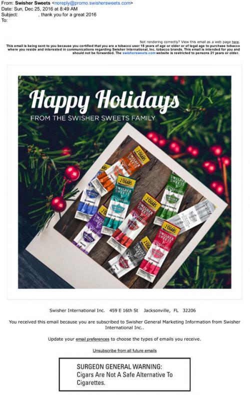 Email from Swisher Sweets in December 2016 wishing the recipient a Happy Holidays from the brand.