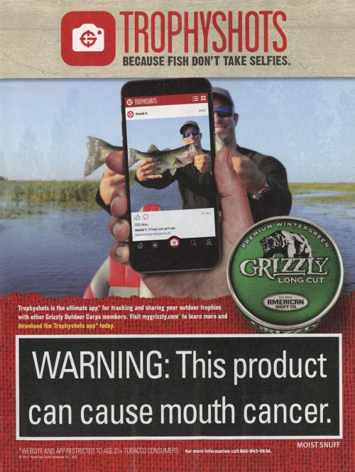 Grizzly magazine ad to promote the Trophy Shots app available on their brand website. Outdoor Corps members are encouraged to download the app and share photos of wild game trophies that they catch. Text: "Because fish don't take selfies"