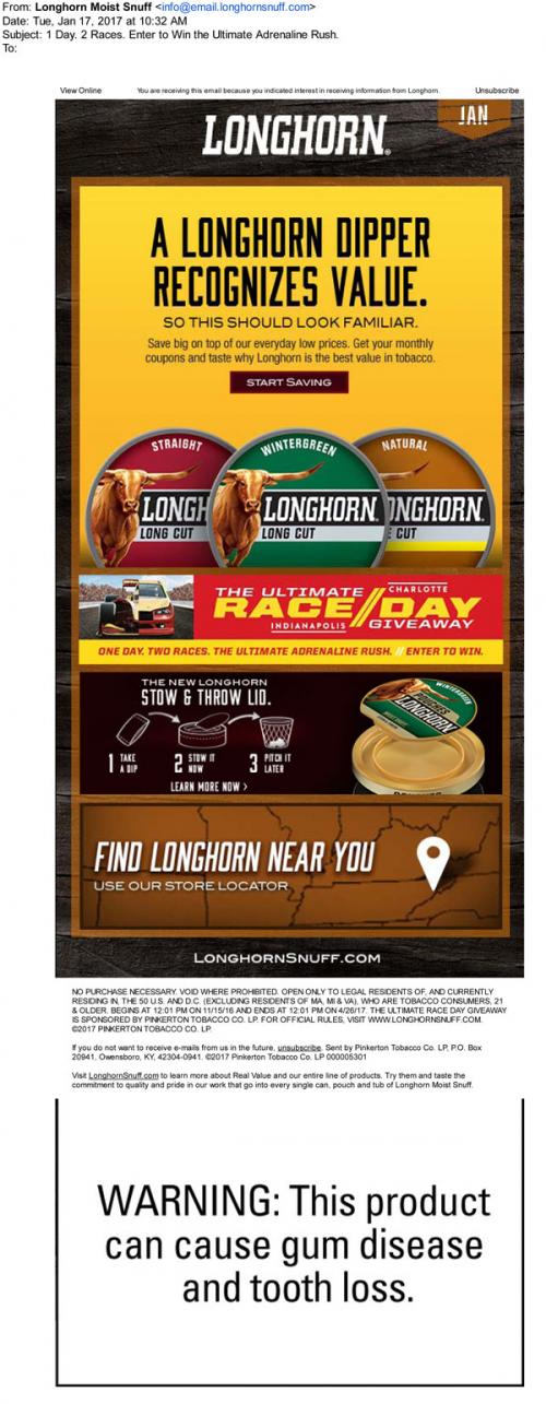 Email from Longhorn in January 2017 reminding the recipient to claim coupons on the brand website. Also promotes the Ultimate Race Day Giveaway, with a link to the site to enter. Imagery demonstrates use of the new "stow & throw" lid they have on their cans, and links to the store locator to find nearby retailers.