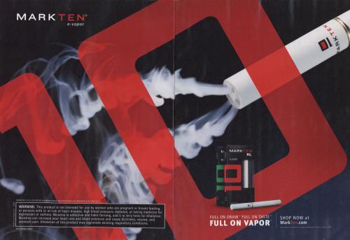 2-page magazine ad for MarkTen e-cigs that shows simulated vapor and their big red "10" logo.