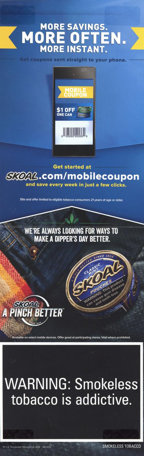 Direct mail from Skoal in September 2016 promoting the instant mobile coupons customers can get sent to their mobile phone. Includes instructions to access the coupons through the brand website. Text: "We're always looking for ways to make a dipper's day better."