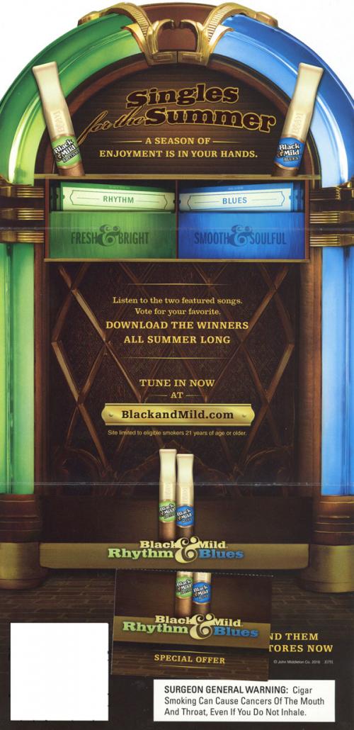 Direct mail from Black & Mild in June 2016, in the shape of a jukebox, to promote the Singles for the Summer free music event. The recipient is invited to the brand website to vote on the featured songs and download the music. The event was part of a promotion for the brand's limited edition "rhythm & blues" cigars. Also includes an offer for a free cigar with purchase.
