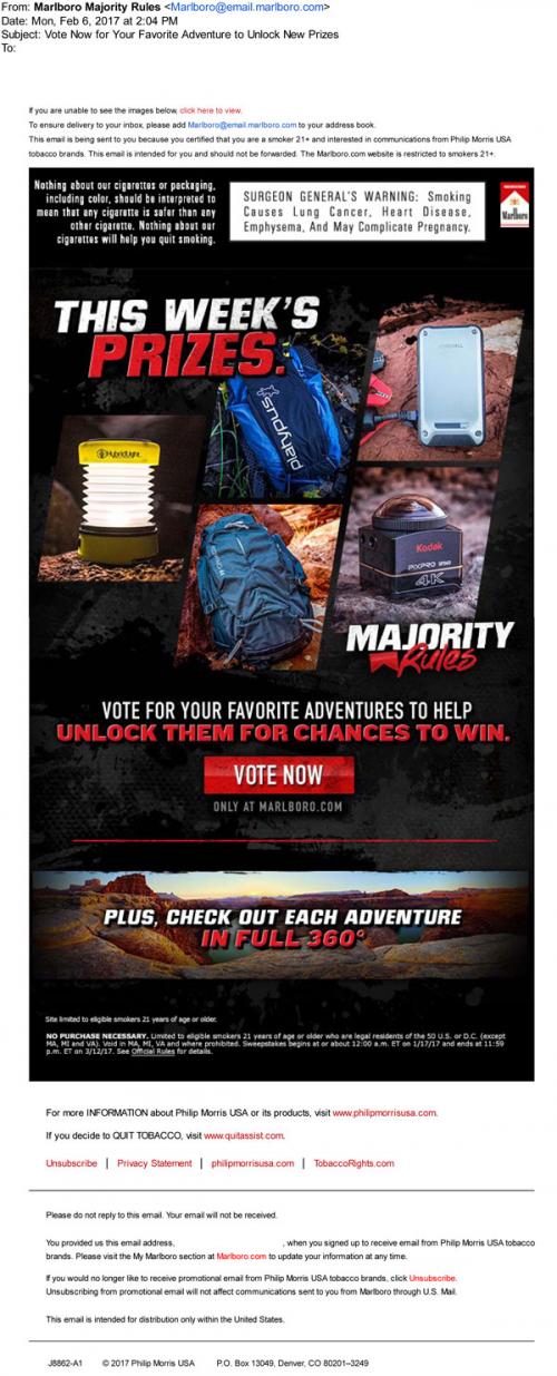 Marlboro email from February 2017 promoting the Majority Rules sweepstakes, with an invitation to visit the brand website and vote in order to win. Includes images of various prizes available to be unlocked, and highlights the ability to check out each adventure in a 360 degree interactive setting.