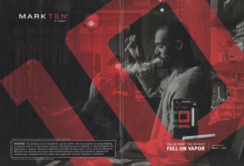 2-page ad for MarkTen e-cigs, featuring a man smoking behind a table while playing cards in a bar. Includes images of their menthol and classic flavors. This version of the ad features a giant "10" logo.