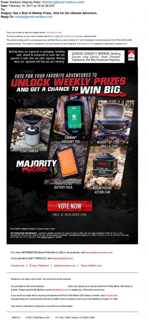 Email from Marlboro in February 2017 to promote the Majority Rules sweepstakes and encourage the recipient to vote daily to win. Shows images of some prizes available that week.