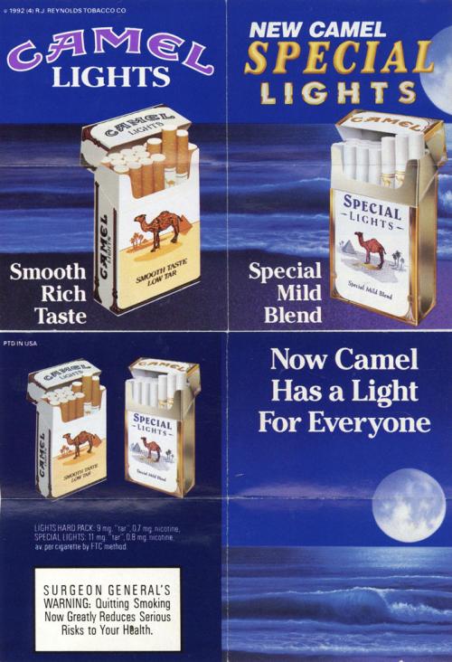 Promotional insert from a pack of Camel cigarettes that advertises their Lights and Special Lights styles, "a Light for everyone."