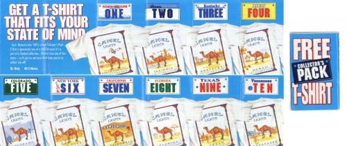 Promotion included on a Camel cigarette pack with an offer for a t-shirt with a limited edition Lights collector pack design, featuring ten US states, in exchange for C-notes (Camel Cash). Includes an order form on the back.