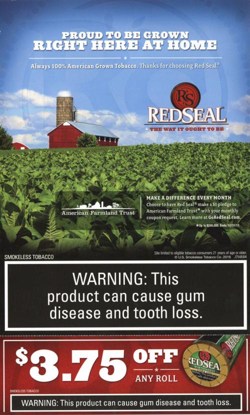 Direct mail from Red Seal in February 2017. Includes a coupon and invites the recipient to help the brand donate money to the American Farmland Trust on the brand websites when they request a monthly coupon. Text: "Proud to be grown right here at home."
