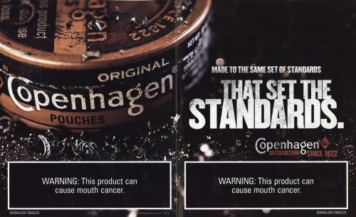 2-page Copenhagen ad featuring a can of pouch style product among metal shavings. Text: "Made to the same set of standards that set the standards."