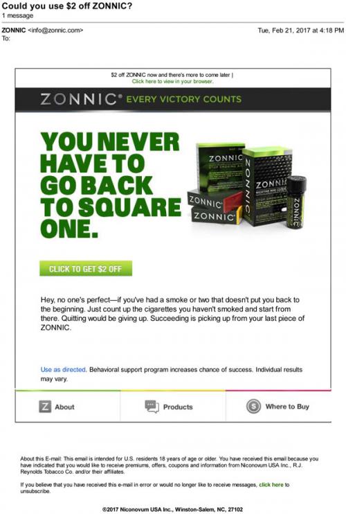 Zonnic email from February 2017 with an offer for a coupon and a reminder that "you never have to go back to square one" with their product, as quitting takes time.