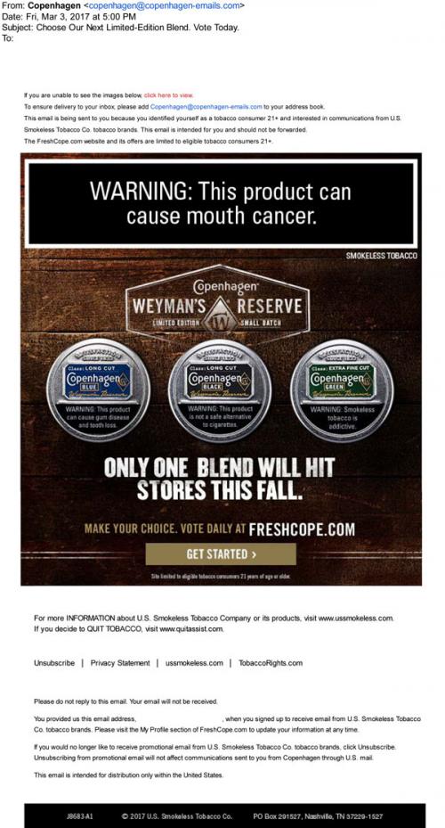 Copenhagen email from March 2017 asking the recipient to vote on the next limited edition blend from the Weyman's Reserve; the product will be released this fall. Links to the brand website and includes a reminder to vote daily.