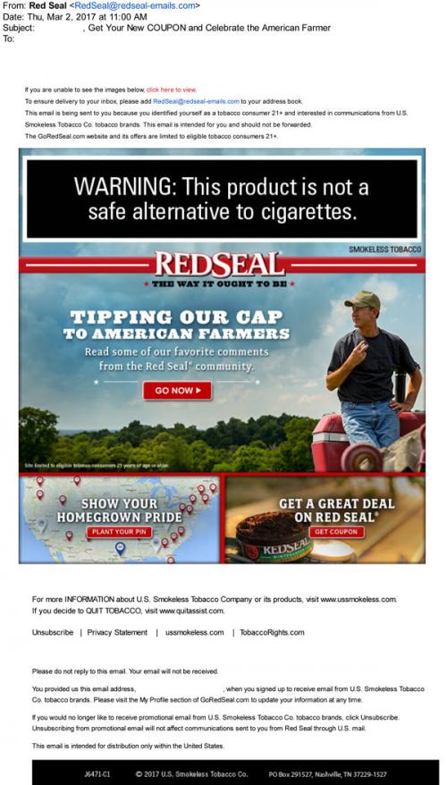 Red Seal email from March 2017 reminding the recipient to claim a coupon on the brand website. Also links to read comments from the Red Seal community about supporting farmers, and a location map to interact with and "show your homegrown pride."