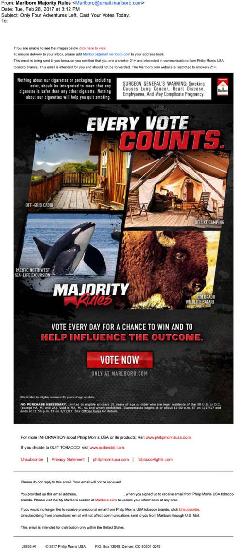 Marlboro email form February 2017 reminding the recipient to vote daily on the brand website for a chance to win and to help choose the final adventure prize in the Majority Rules sweepstakes.