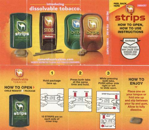 Point of sale instructions for how to open and use the Camel Strips dissolvable tobacco "child resistant" packaging and product.