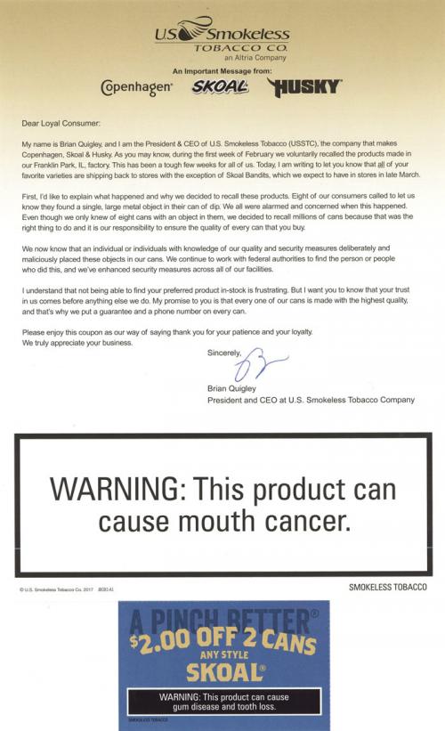 Direct mail from USST regarding the product recall, received in March 2017. The President and CEO apologizes again and offers an explanation for the event. Includes a Skoal coupon to thank the recipient for their patience and loyalty.