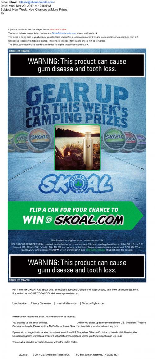 Email from Skoal in March 2017 promoting the Flip to Win sweepstakes, inviting the recipient to "gear up" for this week's camping themed prizes. Links to the brand website to enter.