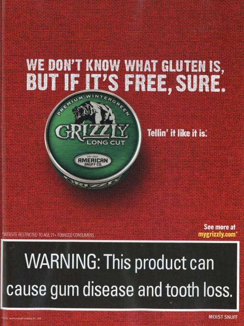 Grizzly magazine ad from the "Tellin' it like it is" series, with a focus on their long cut wintergreen style. Text: "We don't know what gluten is, but if it's free, sure."