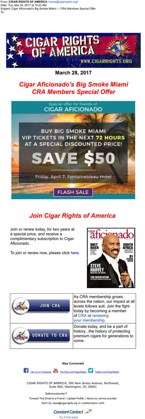 Email from Cigar Rights of America promoting the upcoming Big Smoke event in Miami, FL. For a limited time, tickets are discounted for members. Includes an offer for a subscription to Cigar Aficionado magazine and solicits for donations.