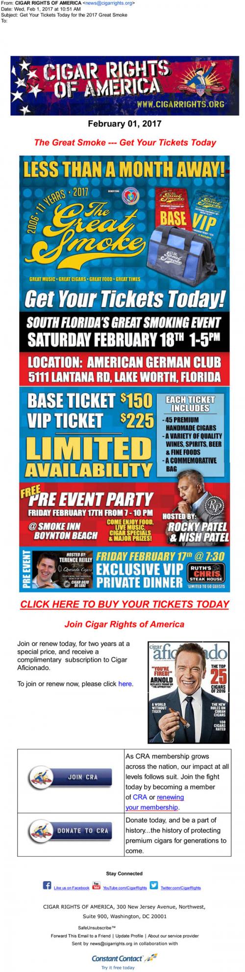Email from Cigar Rights of America in February 2017 promoting the upcoming Great Smoke event in Florida. Includes an offer for a subscription to Cigar Aficionado magazine and solicits for donations.