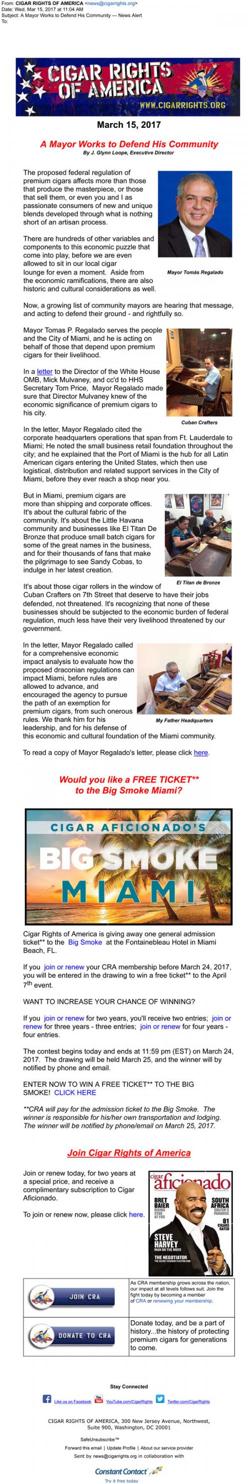 Email from Cigar Rights of America in March 2017 featuring an article about a mayor who is working to protect his community from unfair cigar regulations, claiming a high economic impact. Includes a promotion for the upcoming Big Smoke Miami; customers who renew their membership with the organization can get entries into a drawing to win a free ticket. Includes an offer for a subscription to Cigar Aficionado magazine and solicits for donations.