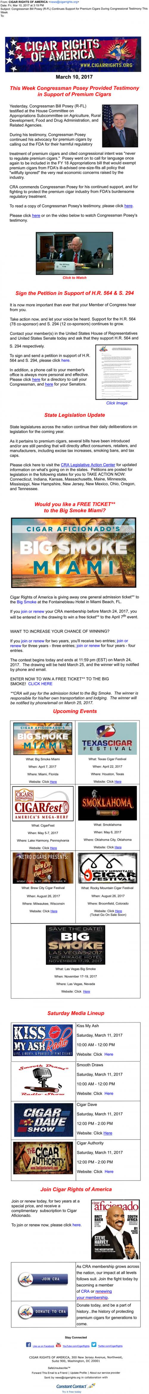 FDA regulation, and S 294 to protect traditional cigar manufacturing. Highlights the testimony of a congressman in support of the bill by linking to text and video versions. Encourages the recipient to contact their representatives