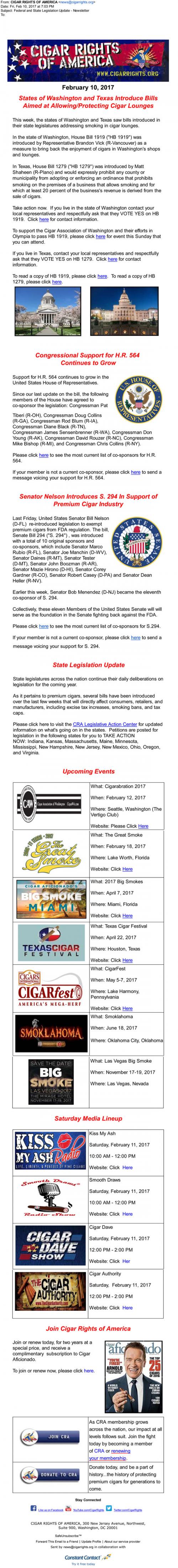 Email from Cigar Rights of America in February 2017 describing new bills introduced in Washington and Texas to allow or protect cigar lounges.Discusses the progress on HR 564 and S 294 to support the premium cigar industry. Encourages the recipient to contact their representatives and ask them to support the bills. Links to coverage about actions taken in state legislatures.