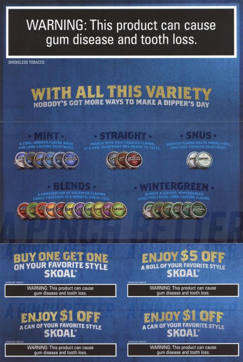Direct mail from Skoal received in April 2017 describing the many product varieties they offer, including styles like snus and flavor blends. Includes coupons. Reminds the recipient to sign up for extra weekly mobile coupons with their phone. Text: "With all this variety nobody's got more ways to make a dipper's day."