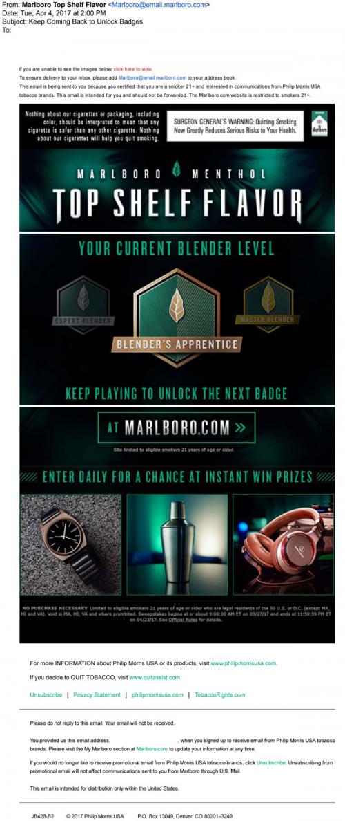 Marlboro Menthol email from April 2017 promoting the Top Shelf Flavor sweepstakes, informing the recipient of their current "blender level." The game involves learning more about the different menthol blends, from packaging to taste to style, and the target marketing for each blend is evident in comparison. Links to the brand website to participate for more entries daily, and shows some tantalizing instant win prizes.