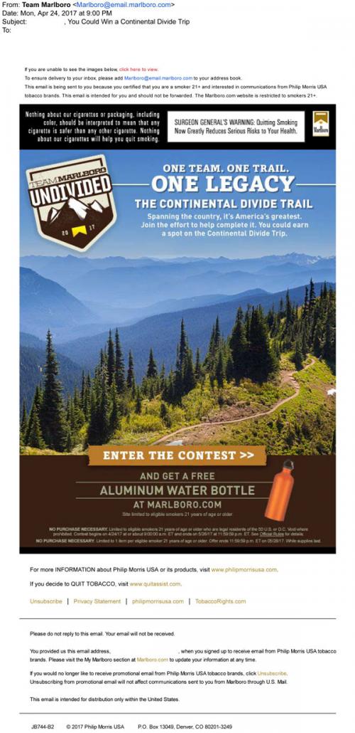 Marlboro email from April 2017 promoting the Team Marlboro Undivided contest. The recipient is invited to join the efforts to complete the Continental Divide Trail, which crosses America, for the chance to earn a trip on the trail. Links to the brand website to enter, with a bonus promotional gift of a free aluminum water bottle for participating.