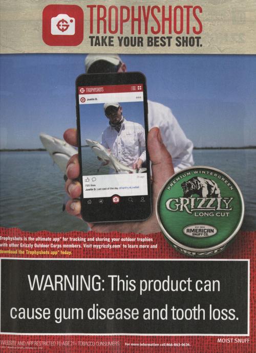 Magazine ad promoting Grizzly's Trophy Shots app, meant for Grizzly Outdoor Corps members to share photos of outdoor trophies with one another. Directs to the brand website to get the app and learn more.