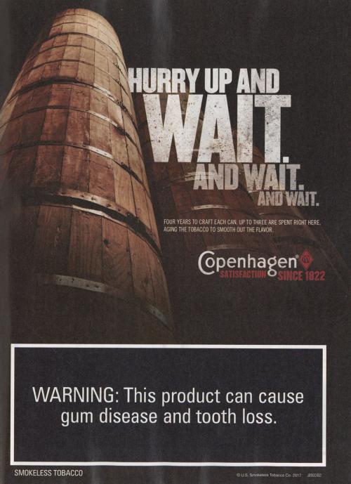 Magazine ad about Copenhagen's aging process "to smooth out the flavor." Text: "Hurry up and wait. And wait. And wait."