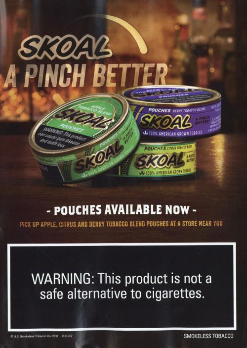 Skoal magazine ad featuring new flavors available in a pouch style: apple, citrus, and berry blends.