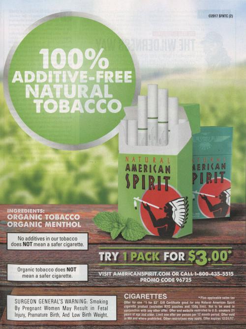 American Spirit ad highlighting their menthol cigarettes, with organic ingredients. Includes a coupon offer to try a pack for 3$; the offer can be claimed with a promo code on the brand website or by phone.