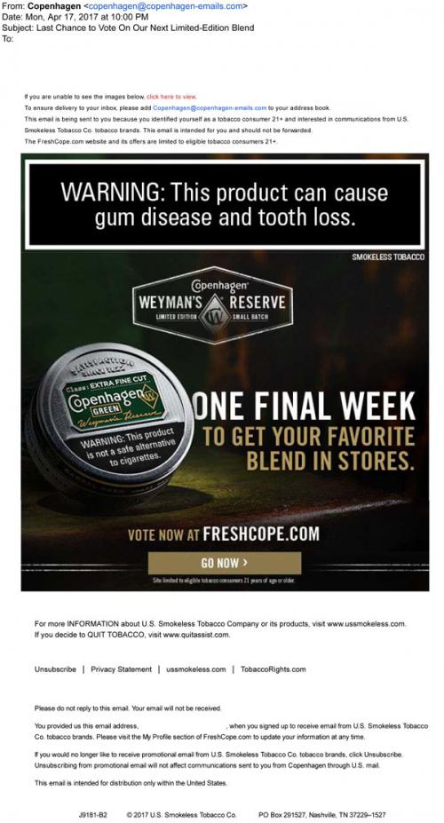 Email from Copenhagen in April 2017 reminding the recipient of the final week to vote on the limited edition Weyman's Reserve blend. Links to the brand website to vote.