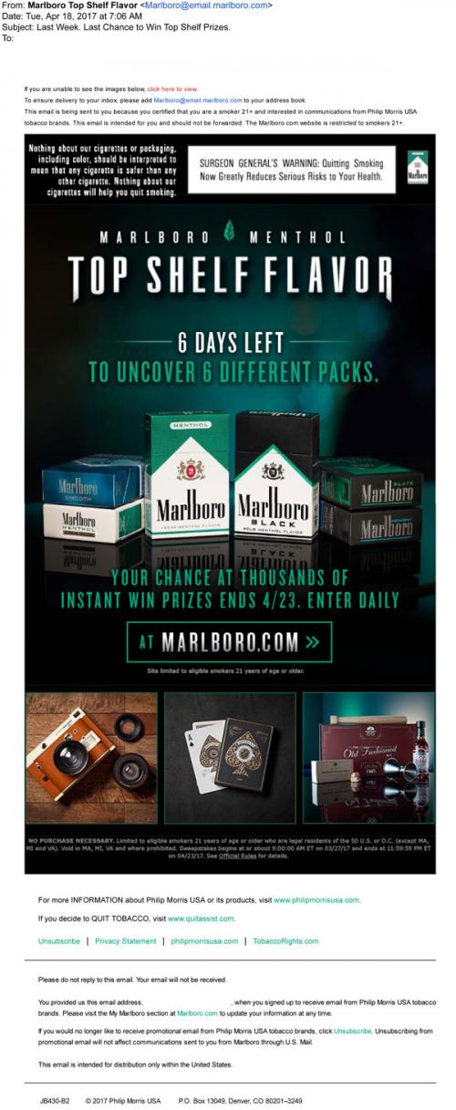 Marlboro Menthol email from April 2017 promoting the Top Shelf Flavor sweepstakes, where visitors to the brand website are invited to explore the different menthol styles available. Reminds the recipient to enter daily to increase their chances of winning prizes, and that the sweepstakes is soon ending.