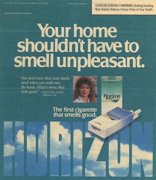 Magazine ad for Horizon cigarettes, marketed as "the first cigarette that smells good." This product was available in a limited range in the southeast US. The ad shows a menthol and regular pack and includes a consumer opinion. Text: "Your home shouldn't have to smell unpleasant."