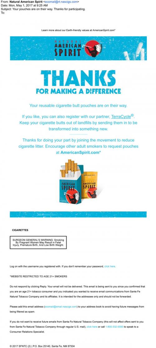 Email from Natural American Spirit in May 2017 letting the recipient know that the reusable cigarette butt pouches are on their way. Also includes a reminder to recycle butts by sending them to a third party recycler, to be turned into something new. Ends the email with a suggestion to invite other adult smokers to request pouches at the brand website.