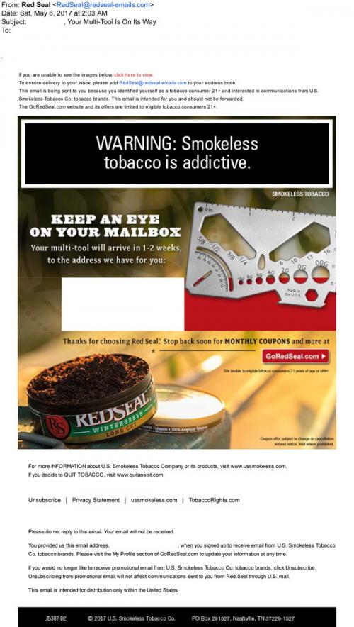 Email from Red Seal in May 2017 letting the recipient know that a free multi-tool promotional gift will be arriving in a few weeks. Mentions the brand website to claim monthly coupons and more.