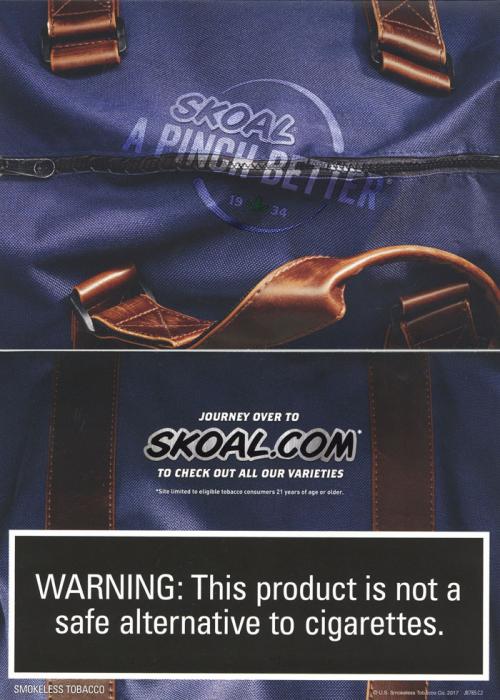 Direct mail piece from Skoal in June 2017 designed to look like a travel bag; to open you must "unzip" the bag. Products are described as "manageable pouches" and implied good for travel. Includes coupons. Text: "Packed with flavor and ready for summer."