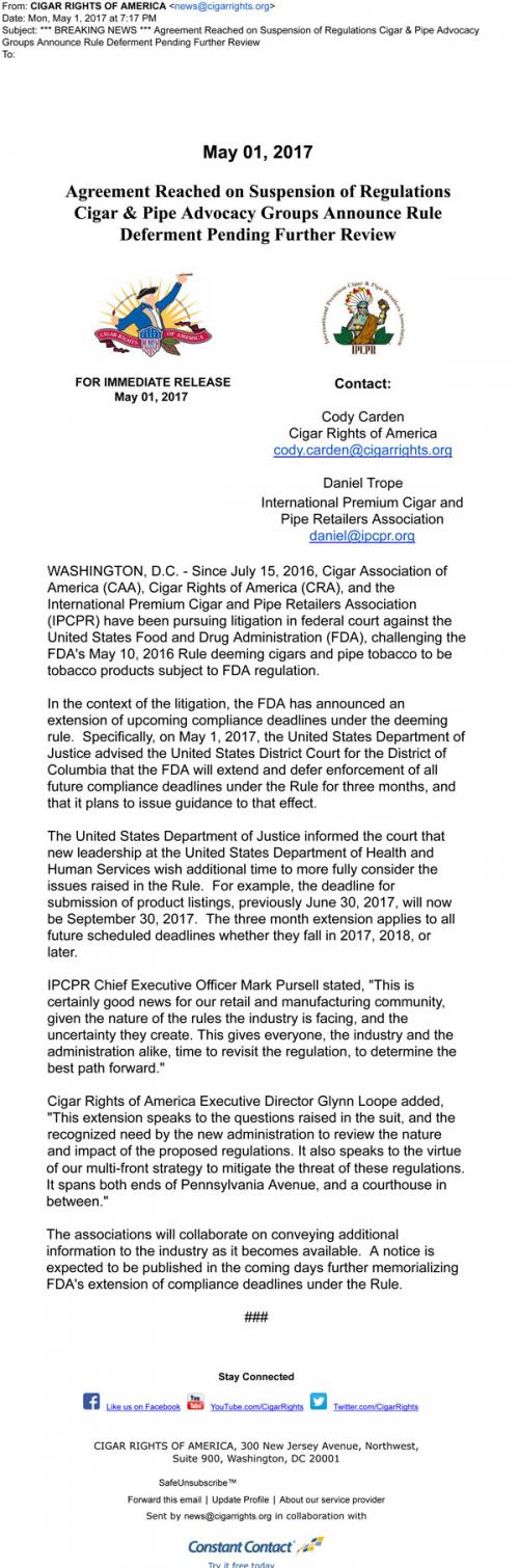 Email from the Cigar Rights of America in May 2017 giving an update on a suspension on a regulation decision.