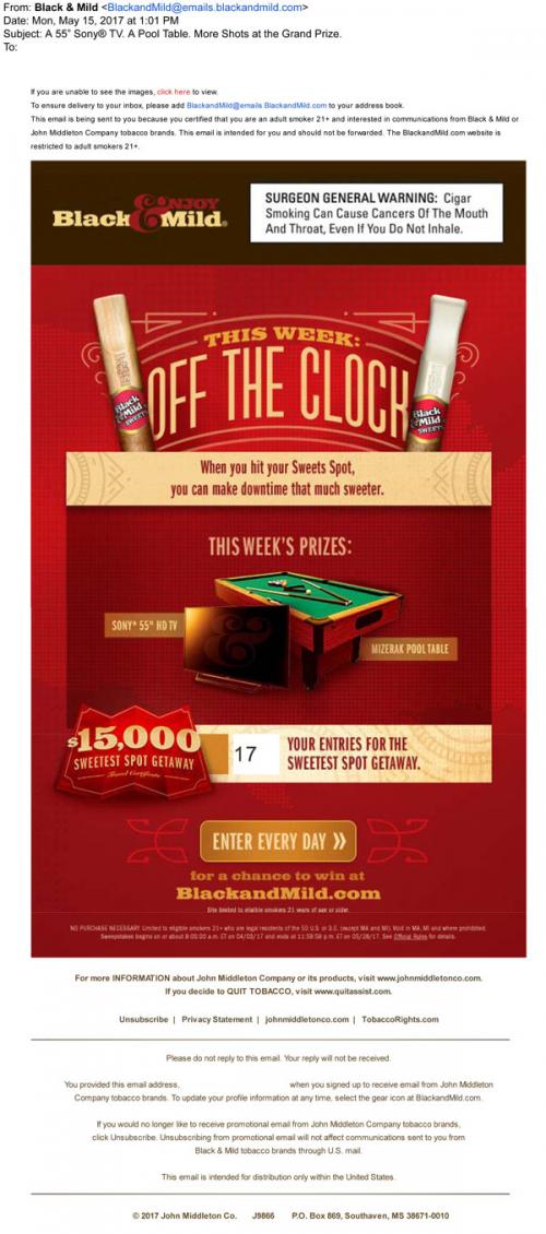 Black & Mild email promoting the Sweets Spot sweepstakes, with an