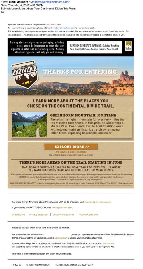 Team Marlboro email from May 2017 thanking the recipient for entering the Undivided contest. Links to learn more about the Continental Divide trail, and also mentions future aspects of the project in June when Marlboro will start donating money. Participation in the voting for the funds' direction gets the recipient free leather work gloves.
