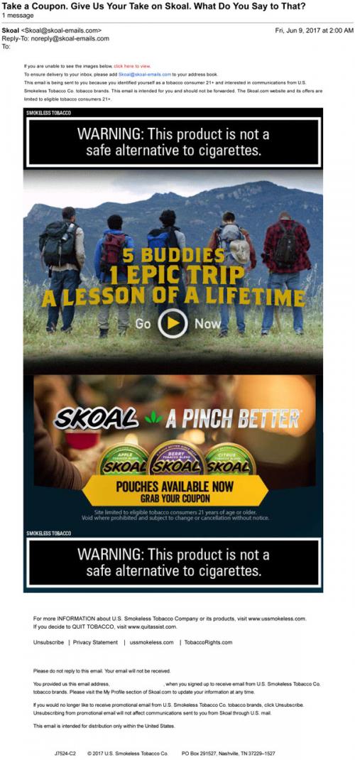 Email from Skoal in June 2017 inviting the recipient to claim a coupon on the brand website. Also promotes a video series of guy friends on a trip, and their flavored pouch products.