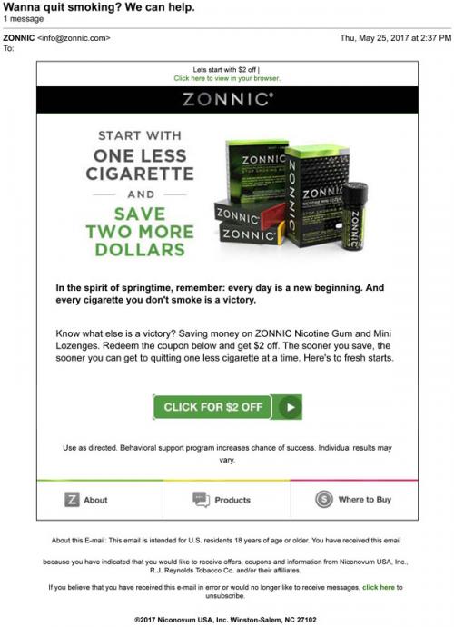 Zonnic email from May 2017 "in the spirit of springtime," giving advice for quitting along with a link to a coupon to claim.
