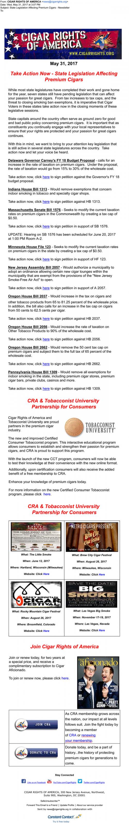 Email from Cigar Rights of America in May 2017 outlining current state legislation affecting premium cigars, providing links to take action and sign petitions for or against the proposals. Provides info on The Tobacconist University partnership for consumers and lists upcoming cigar events. Also asks for donations and memberships.