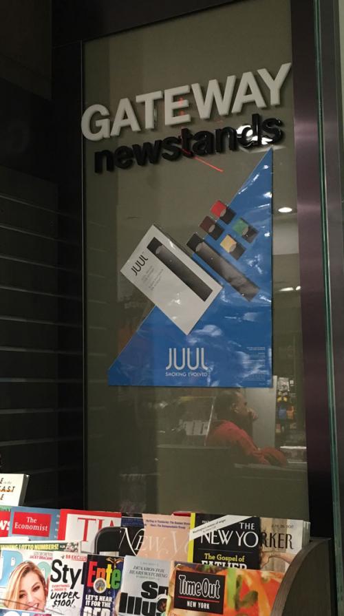 Indoor point-of-sale signs for JUUL seen in a Gateway news stand in New York City, NY. Both advertise the package that includes a USB charger and four flavors. One sign is located above the magazines, and the other above the tobacco rack.